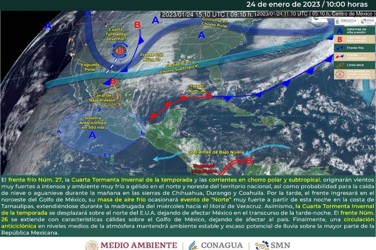 “Este es un pronóstico extendido hasta el día jueves y posiblemente hasta el día viernes, pero lo más importante ahorita es que ya la Cuarta Tormenta Invernal estará hoy (martes) por la tarde noche interactuando en nuestro país y eso, pues las temperaturas no van a estar tan bajas”.