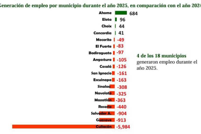 El análisis municipal revela una marcada diferencia y en Culiacán, el principal motor económico del Estado, sufrió el golpe más fuerte en términos absolutos al perder cinco mil 984 empleos, una caída del 2.2 por ciento, no obstante, la capital sinaloense sigue concentrando la mayor parte de la fuerza laboral con el 44.2 por ciento del total de trabajadores en la entidad.