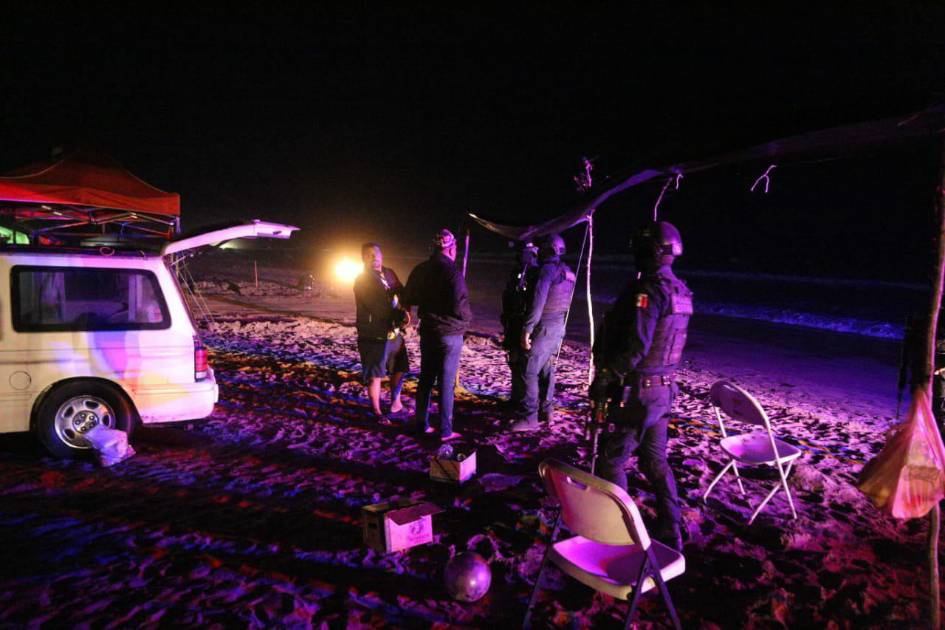 En apego a las medidas sanitarias para evitar aglomeraciones ante el coronavirus, elementos de la Policía Estatal evitan que los turistas acampen en playas de Navolato.