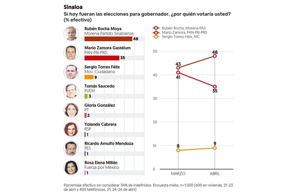 A poco más de un mes de que se lleven a cabo las elecciones locales, en Sinaloa el candidato de la alianza conformada por PRI, PAN y PRD, Mario Zamora Gastélum, se ubica a 13 puntos atrás de Rubén Rocha Moya, candidato de Morena y el PAS.