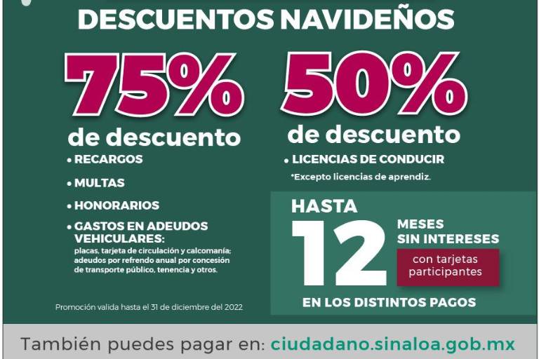 CULIACÁN._ El 31 de diciembre será el último día para aprovechar los descuentos del 75 por ciento en trámites vehiculares, informó el Servicio de Administración Tributaria del Estado de Sinaloa, a través de un comunicado de prensa.