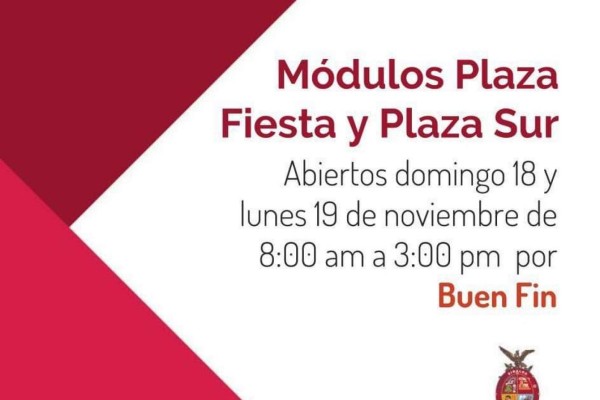 A través de un comunicado de prensa, el Gobierno estatal informó que se trata de los módulos de Recaudación de Plaza Fiesta y Plaza Sur, en horario de 08:00 a 15:00 horas.