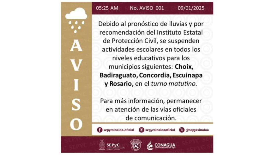 “Debido al pronóstico de lluvias y por recomendación del Instituto Estatal de Protección Civil, se suspenden actividades escolares en todos los niveles educativos para los municipios siguientes: Choix, Badiraguato, Concordia, Escuinapa y Rosario, en el turno matutino”, indicó.