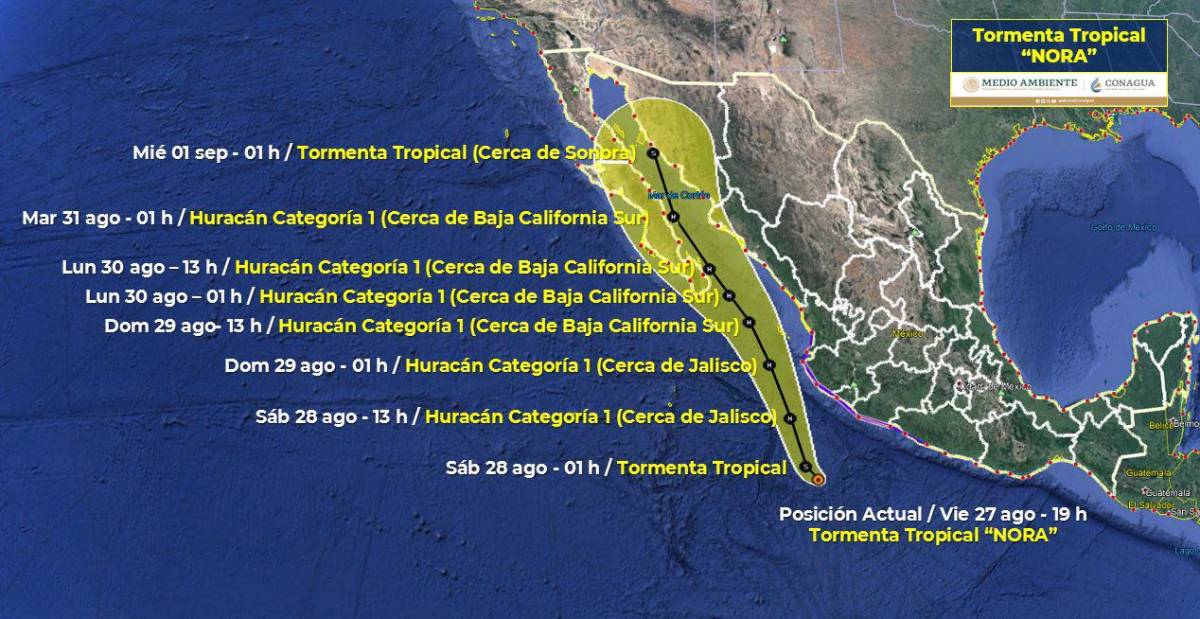 “Deslaves e inundaciones se pueden causar por Nora”, dijo Ramón López de PC estatal, “actualmente, en este momento, tiene vientos sostenidos de 100 kilómetros por hora”, agregó sobre el fenómeno natural que para el domingo se prevé sea huracán, las lluvias en los estados de Oaxaca, Guerrero, Michoacán, Nayarit, las bajas californias y Sinaloa, será intensas y torrenciales.