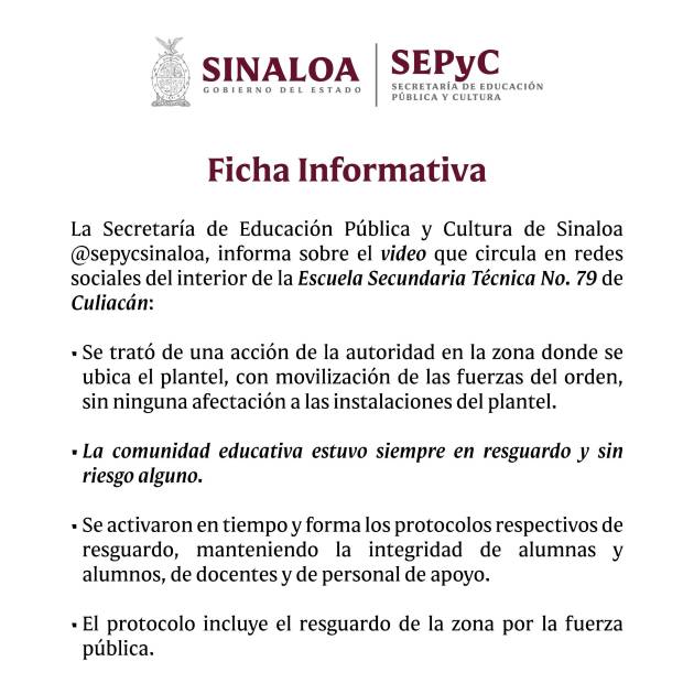 CULIACÁN._ La Secretaría de Educación Pública y Cultura de Sinaloa explicó que la Escuela Secundaria Técnica número 79 aplicó un protocolo de seguridad ante disparos en una zona aledaña y el posterior despliegue de fuerzas de seguridad en el sector.