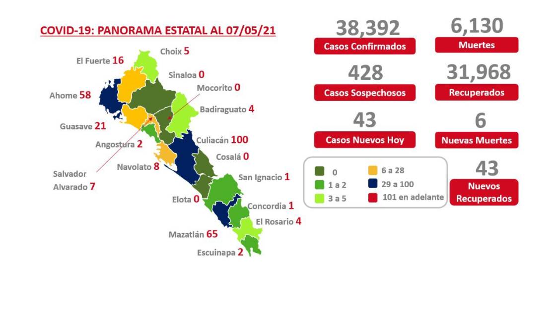 Conforme al más reciente reporte de cifras Covid-19 que emite diariamente la Secretaría de Salud, en Sinaloa se sumaron este viernes seis decesos y se registraron 43 nuevos pacientes con el virus.
