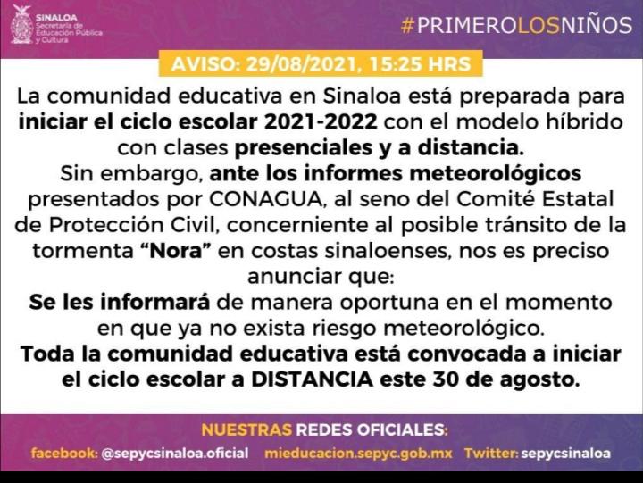 En el aviso se destacó que la comunidad educativa en Sinaloa está preparada para iniciar el ciclo escolar 2021-2022 con el modelo híbrido con clases presenciales y a distancia. Sin embargo, ante los informes meteorológicos presentados por Conagua, al seno del Comité Estatal de Protección Civil, concerniente al posible tránsito de la tormenta ‘Nora’ en costas sinaloenses es que se tomó esta decisión.