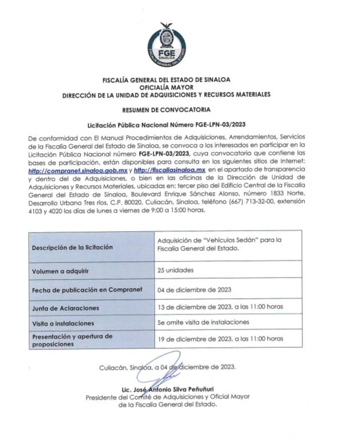 Por último, la Fiscalía lanzó el proceso de licitación FGE-LPN-03/2023 referente para reforzarse con 25 automóviles tipo sedán, destinados a la propia Fiscalía, la convocatoria fue expuesta apenas el 4 de diciembre y el proceso culminaría hasta el 22 del mismo mes.