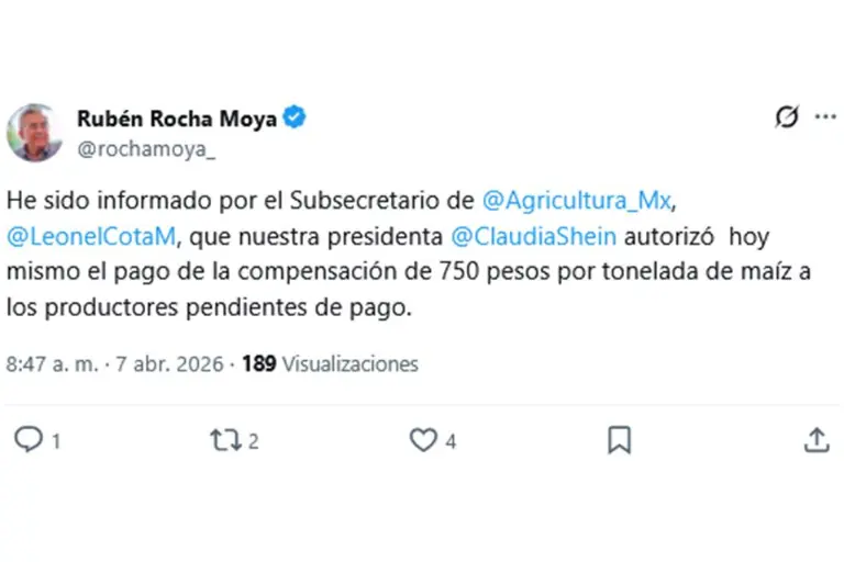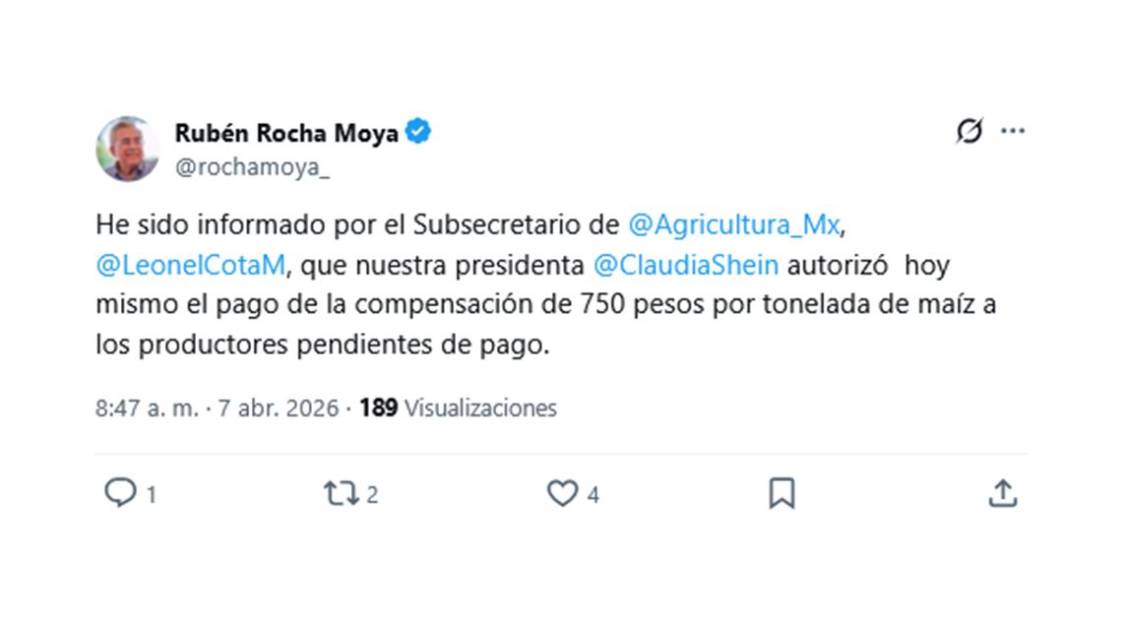 “He sido informado por el Subsecretario de @Agricultura_Mx, @LeonelCotaM, que nuestra presidenta @ClaudiaShein autorizó hoy mismo el pago de la compensación de 750 pesos por tonelada de maíz a los productores pendientes de pago”, expuso en redes.