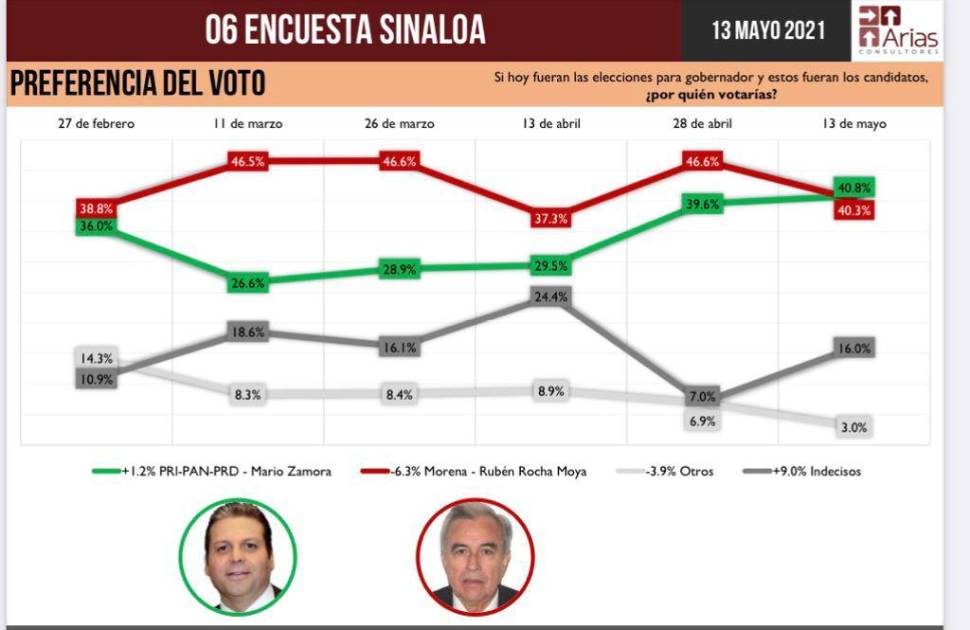 Mario Zamora Gastélum presumió, en un comunicado, que, con un 40.8 por ciento, el candidato del PRI, PRD y PAN lleva la delantera. Este ejercicio, de acuerdo con el estudio difundido este viernes, se levantó del 9 al 13 de mayo, en el que Zamora Gastélum creció 1.2 por ciento, pasando de 39.6 a 40.8 por ciento; pero considerando la medición publicada el 13 de abril, cuando estaba en 29.5 por ciento, el crecimiento ha sido cercano a los 12 puntos porcentuales para ponerse por encima del candidato de Morena-PAS, Rubén Rocha Moya, quien cayó 6.3 puntos al pasar de 46.6 a 40.3 por ciento.