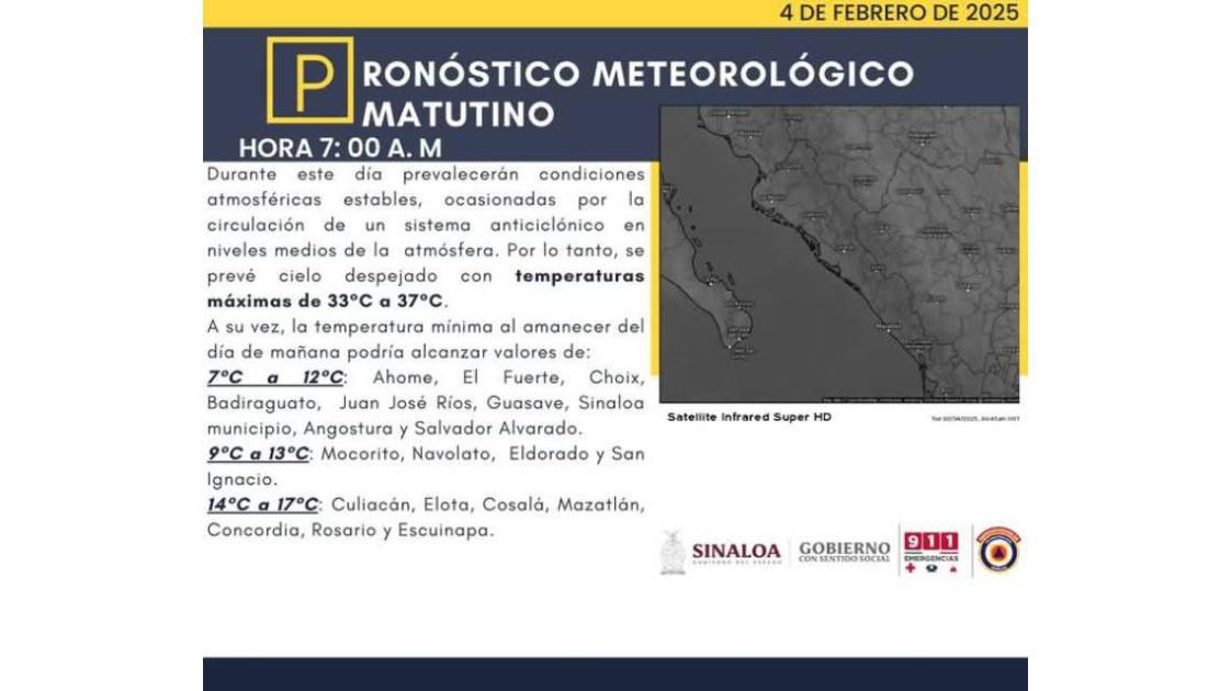 Durante el transcurso de este martes prevalecerá un clima cálido en Sinaloa, con temperaturas máximas que alcanzarían los 37 grados, de acuerdo con el Instituto Estatal de Protección Civil.