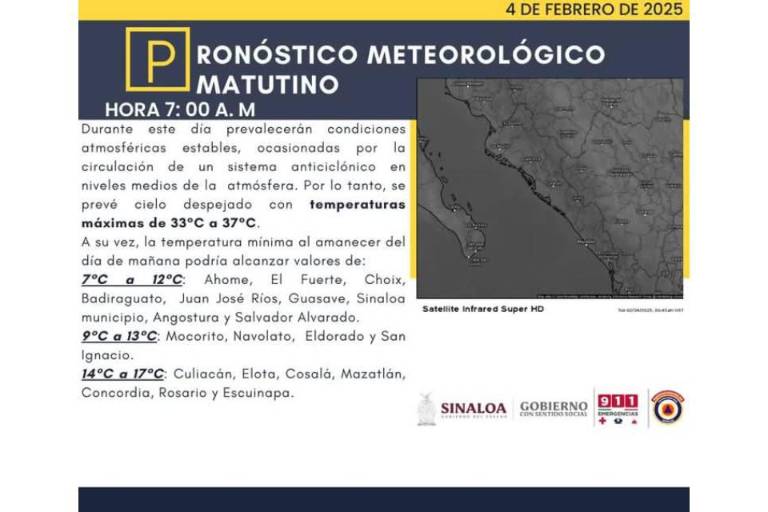 En el caso de regiones de Mocorito, Eldorado, San Ignacio y Navolato las mínimas al amanecer serían de entre 9 y 13 grados; mientras que en Culiacán, Mazatlán, Cosalá, Elota, Escuinapa, Concordia y El Rosario el descenso llegaría entre los 14 y 17 grados.
