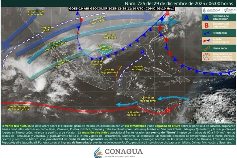 De acuerdo con el Servicio Meteorológico Nacional, este 29 de diciembre el sistema frontal se desplazará sobre el litoral del Golfo de México, interactuando con un río atmosférico y provocando incluso la caída de nieve o aguanieve en las sierras de Chihuahua y Durango, sin embargo, para la región del Pacífico Norte, específicamente en Sinaloa, se pronostica un cielo medio nublado, pero sin probabilidad de lluvias.