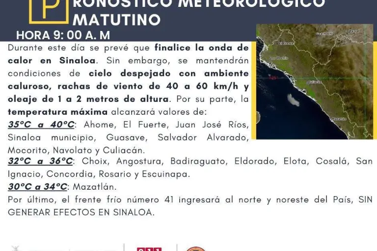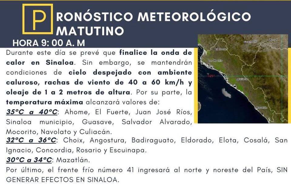 Aunque la onda de calor concluye, las altas temperaturas no darán tregua en gran parte de la entidad, ya que en los municipios del norte y centro-norte se esperan entre 35 y 40 grados en zonas como Ahome, El Fuerte, Juan José Ríos, Sinaloa municipio, Guasave, Salvador Alvarado, Mocorito y Navolato.