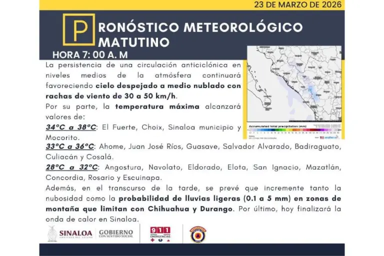 Este lunes 23 de marzo, Sinaloa vive la etapa final de la reciente onda de calor, aunque el termómetro seguirá presente en el norte del Estado, donde se esperan las temperaturas más altas de la región.