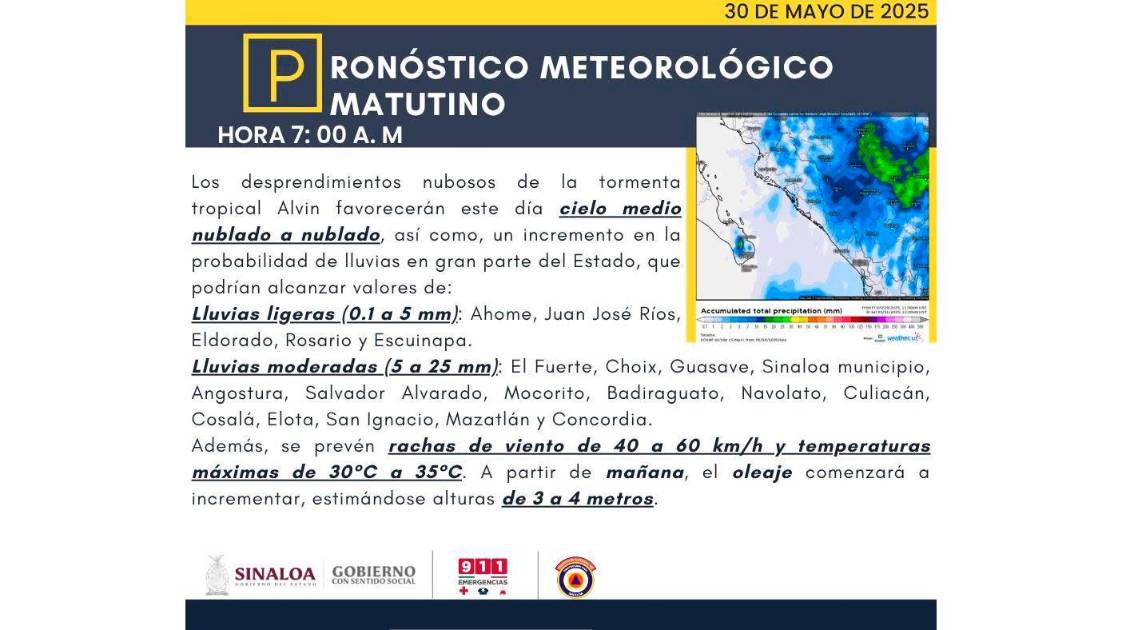 De acuerdo con el Instituto Estatal de Protección Civil, la tormenta tropical Alvin podría dejar lluvias en Sinaloa este viernes.