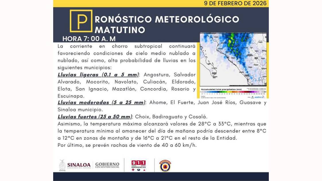 La presencia de una corriente en chorro subtropical sobre el Sinaloa mantendrá condiciones de cielo nublado a medio nublado, provocando un temporal de lluvias de diversa intensidad y un descenso en las temperaturas, especialmente en las zonas serranas de hasta 8 grados.