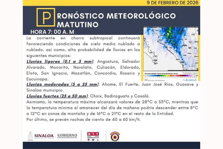 De acuerdo con los reportes meteorológicos de este 9 de febrero, el fenómeno meteorológico también generará lluvias moderadas en el norte del estado, específicamente en Ahome, El Fuerte, Juan José Ríos, Guasave y Sinaloa municipio.