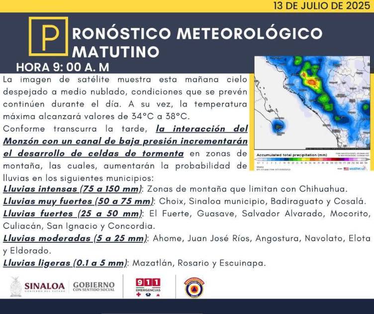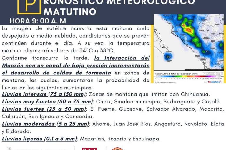 Para municipios como Ahome, Angostura, Navolato, Juan José Ríos, Elota y Eldorado, el instituto vaticina el desarrollo de lluvias moderadas; y en el sur de Sinaloa, desde Mazatlán, Rosario y Escuinapa, las más ligeras.
