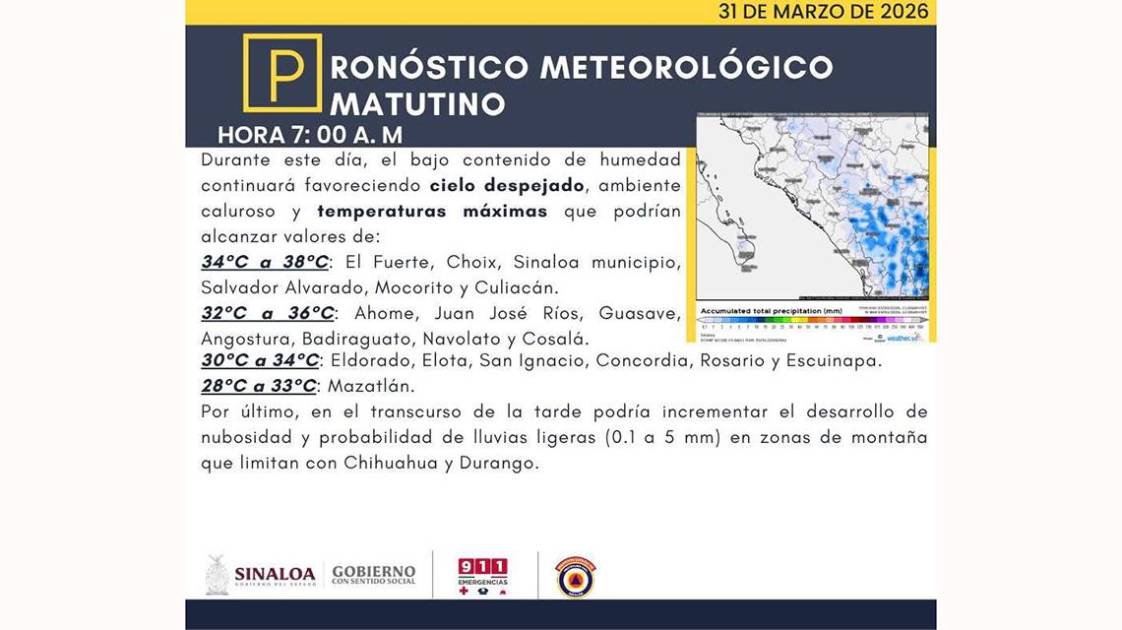 Sinaloa atraviesa una jornada de intenso calor debido al bajo contenido de humedad, un ambiente caluroso en la mayor parte del territorio estatal y posibles lluvias en la sierra durante este 31 de marzo.