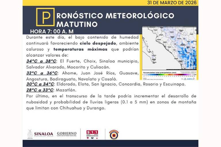 Otras regiones como Ahome, Juan José Ríos, Guasave, Angostura, Badiraguato, Navolato y Cosalá mantendrán máximas de entre 32 y 36 grados.
