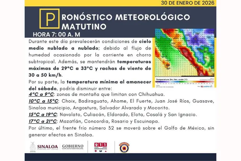 Para Culiacán, este 30 de enero, a pesar de la nubosidad persistente, el ambiente se mantendrá cálido durante la tarde y se espera una temperatura máxima de 33 grados y una mínima de 16 grados.