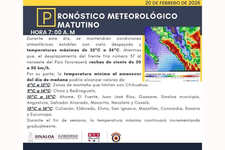 De acuerdo con el reporte meteorológico matutino de este 20 de febrero, el Estado mantendrá temperaturas máximas de 32 y 36 grados y el fenómeno meteorológico también favorecerá rachas de viento de entre 30 a 50 kilómetros por hora en territorio sinaloense.