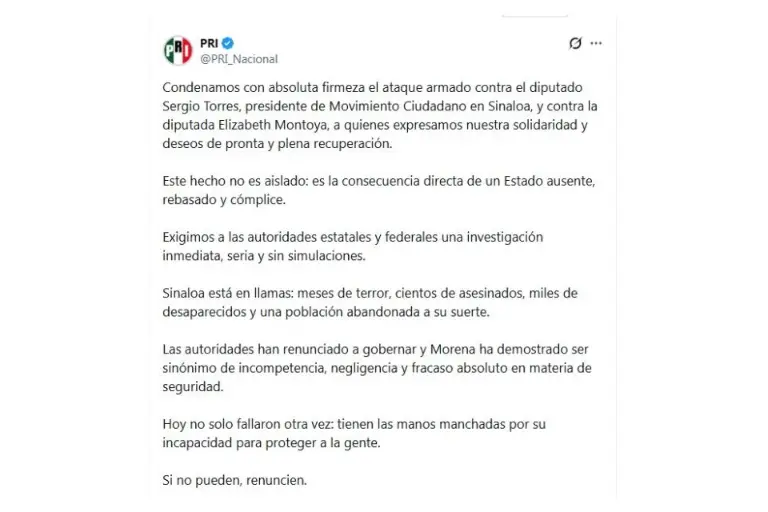 El Partido Revolucionario Institucional a nivel nacional condenó de manera enérgica el ataque armado ocurrido en Culiacán contra el Diputado local Sergio Torres, presidente de Movimiento Ciudadano en Sinaloa, así como contra la Diputada local Elizabeth Montoya Ojeda, al considerar que los hechos reflejan el grave deterioro de la seguridad en la entidad.