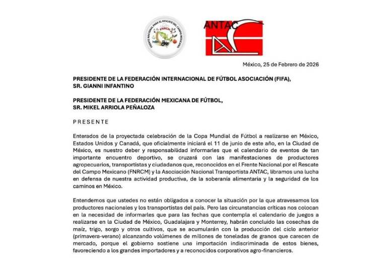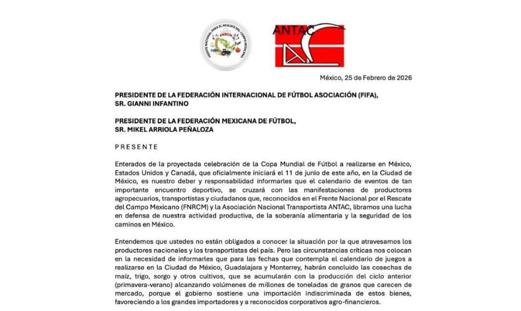 En una carta fechada el 25 de febrero de 2026, dirigida al presidente de la FIFA, Gianni Infantino, y al titular de la Federación Mexicana de Fútbol, Mikel Arriola Peñaloza, las organizaciones señalaron que su movimiento busca defender la actividad productiva, la soberanía alimentaria y la seguridad en los caminos del país.