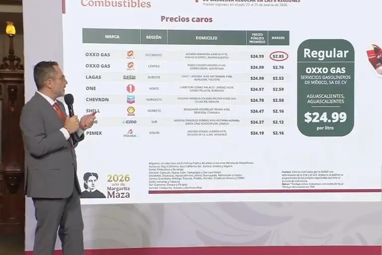 De acuerdo con el reporte, varias estaciones en distintas entidades del país concentran los precios más elevados en gasolina regular, con costos cercanos a los 25 pesos por litro. Entre ellas se encuentran OXXO Gas, en Aguascalientes: 24.99 pesos por litro; OXXO Gas, en Querétaro: 24.99 pesos por litro; LaGas, en Yucatán: 24.99 pesos por litro; ONE, en Durango: 24.97 pesos por litro; Chevron, en Culiacán: 24.70 pesos por litro;