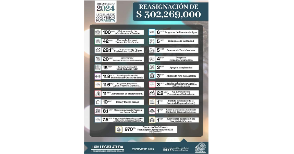 El Congreso del Estado reasignó más de 302 millones 269 mil pesos en el presupuesto para el ejercicio fiscal 2024 en Sinaloa, respecto a la propuesta inicial que hizo el Gobierno de Sinaloa. Dichas reasignaciones fueron dirigidas a 23 conceptos diferentes.