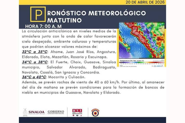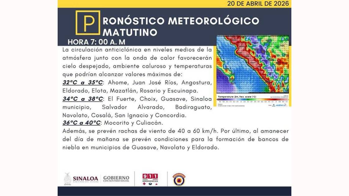 De acuerdo con los reportes meteorológicos, esta jornada se concentra en el centro del Estado, específicamente en Mocorito y Culiacán, donde se pronostican las temperaturas más altas de la entidad, con valores que oscilarán entre los 36 y los 40 grados.