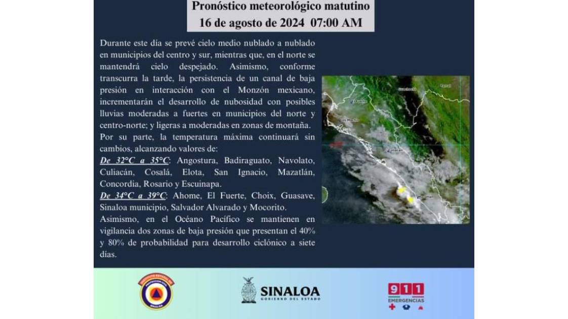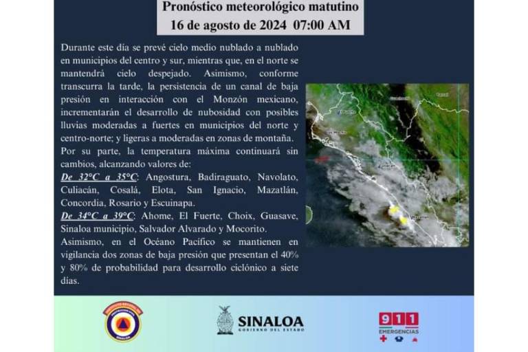 Para este viernes en Sinaloa se pronostican lluvias moderadas a fuertes en la zona norte de la entidad, a partir de la tarde-noche, de acuerdo con la proyección de Protección Civil.