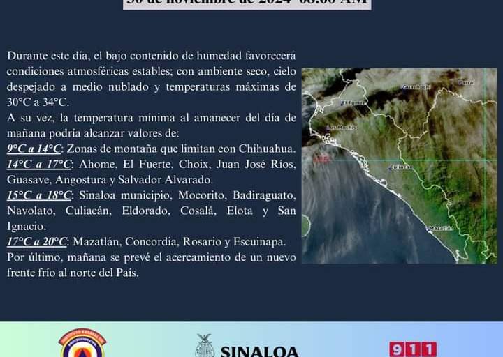 Mientras que los municipios del sur de Sinaloa, de Mazatlán, El Rosario, Escuinapa y Concordia, bajarían a los 17 y 20 grados.