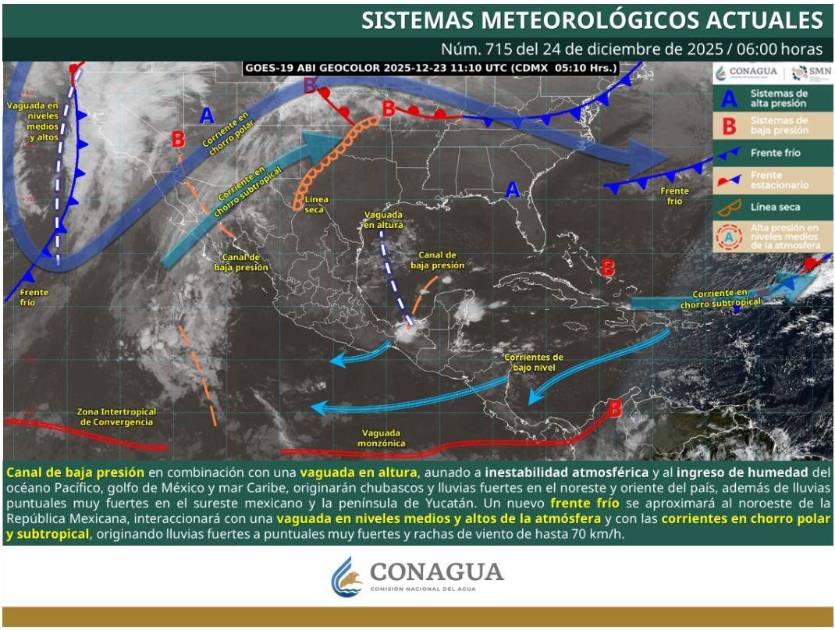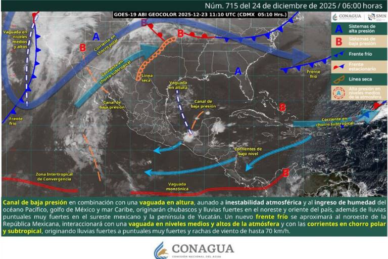 El frente frío interaccionará con una vaguada, que es una zona alargada de baja presión atmosférica en los mapas del tiempo, en niveles medios y altos de la atmósfera, así como con las corrientes en chorro polar y subtropical, lo que podría originar lluvias fuertes y rachas de viento de hasta 70 kilómetros por hora en el noroeste del País.