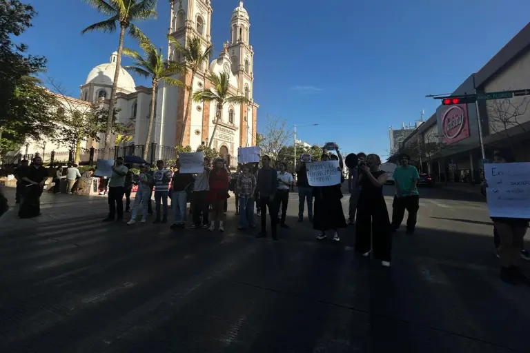 La movilización se concentró sobre la Avenida Álvaro Obregón, una de las principales vialidades de Culiacán, donde los inconformes bloquearon el paso vehicular y se apostaron frente a la Catedral Basílica de Nuestra Señora del Rosario, con pancartas y consignas dirigidas a las autoridades estatales.