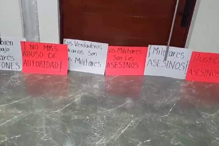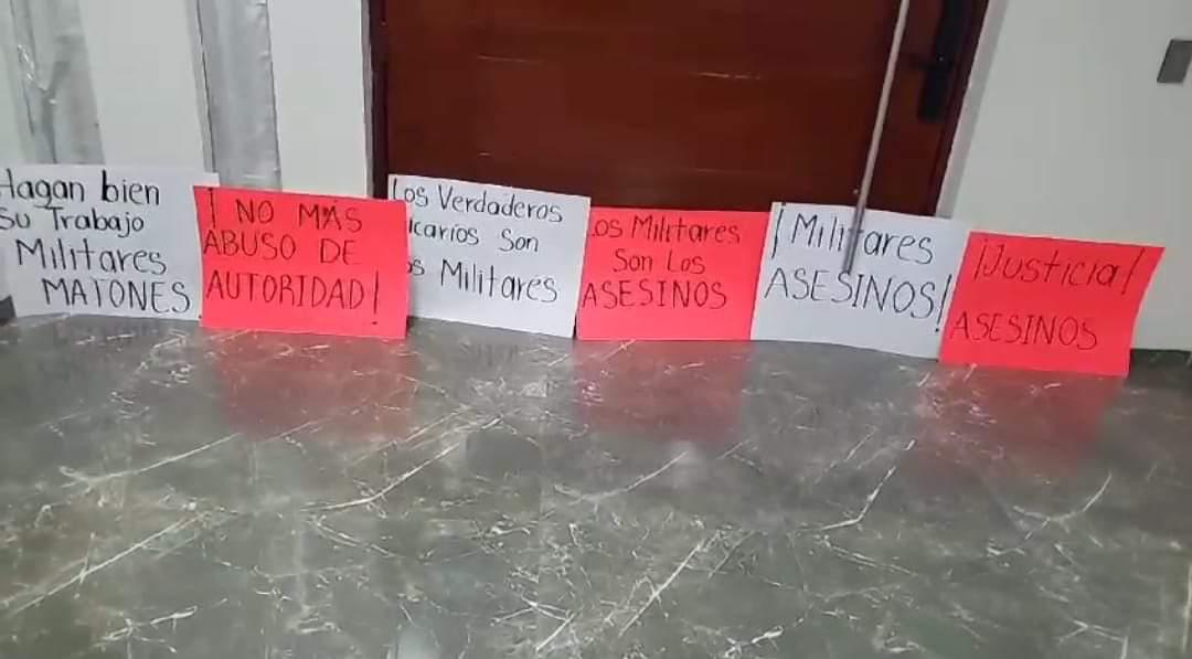 En las afueras de la casa ejidal, los vecinos dejaron pancartas y gritaron señalamientos contra elementos del Ejército.