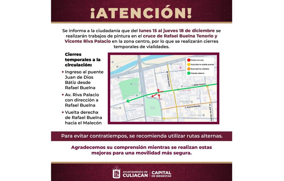 Entre los cierres más importantes se encuentra el ingreso al puente Juan de Dios Bátiz desde Rafael Buelna; la avenida Riva Palacio con dirección a Rafael Buelna; la vuelta derecha de Rafael Buelna hacia el Malecón y la intervención contempla la aplicación de pintura urbana, cuyo objetivo es proteger a los peatones, mejorar la accesibilidad y generar un entorno más funcional y ordenado.