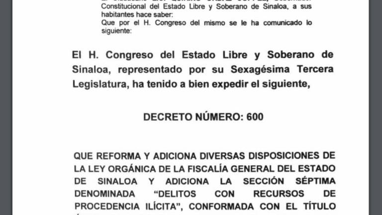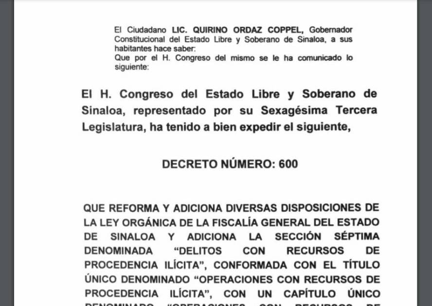 El Periódico Oficial el Estado de Sinaloa publicó el decreto número 600, que reforma y adiciona a la Ley Orgánica de la Fiscalía General del Estado de Sinaloa y toda una sección, la séptima, que detalla los delitos con recursos de procedencia ilícita y operaciones con recursos de procedencia ilícita.