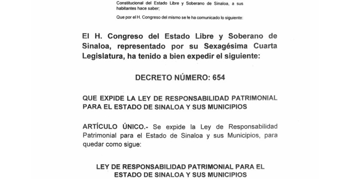 Oficialmente entró en rigor la Ley de Responsabilidad Patrimonial para el Estado de Sinaloa, que pretende proteger los derechos de las personas cuyo patrimonio haya resultado dañado por el Gobierno de Sinaloa y los ayuntamientos.