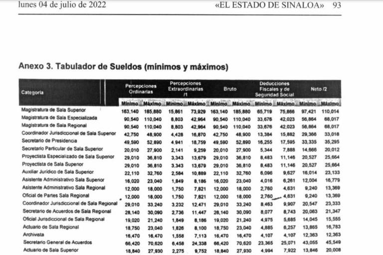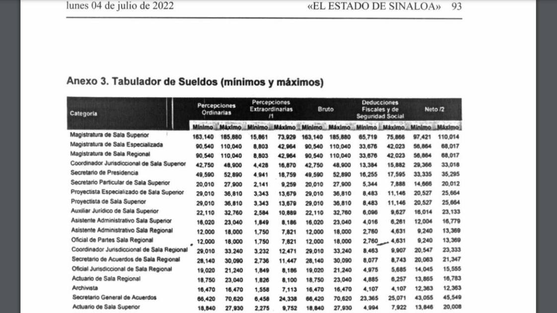 CULIACÁN._ Este lunes, el Tribunal de Justicia Administrativa publicó el acuerdo con que se crea el manual de remuneraciones, en donde detalla que los magistrados de Sala Superior del Poder Judicial, recibirán un sueldo mensual de casi 186 mil pesos en este ejercicio fiscal de 2021.