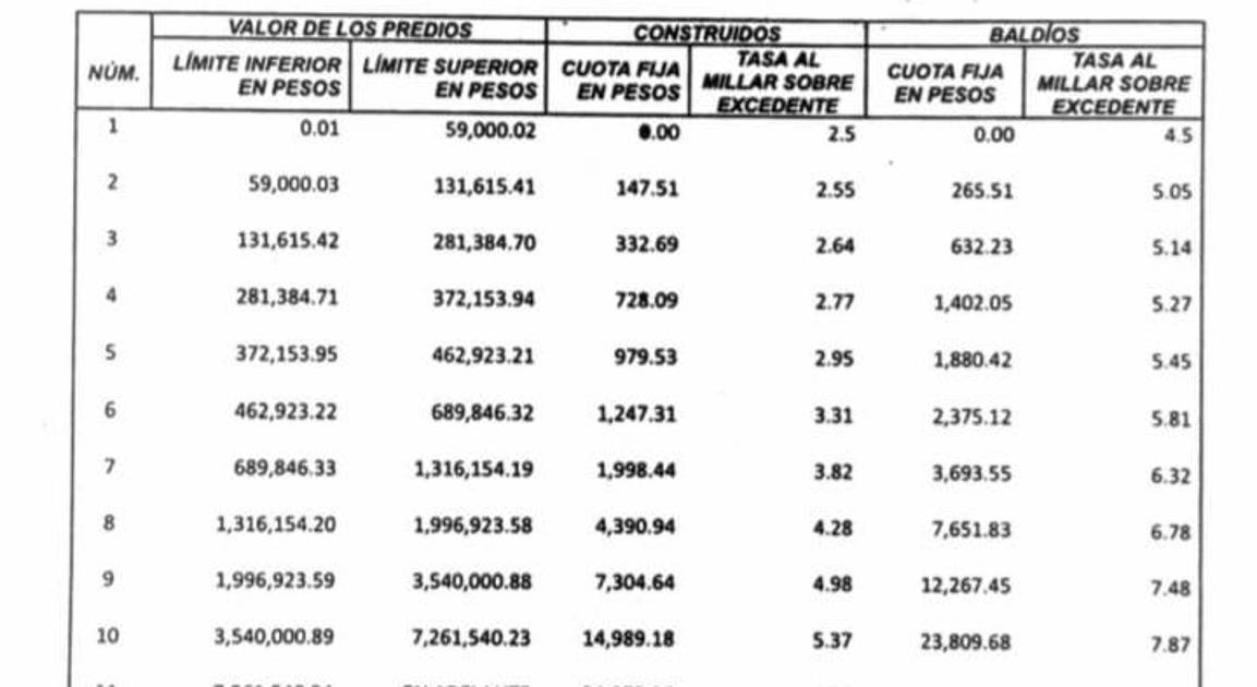 Asimismo, marca una cuota fija que va desde los 147.51 pesos y alcanza los 34 mil 973.86 para los predios de mayor valor.