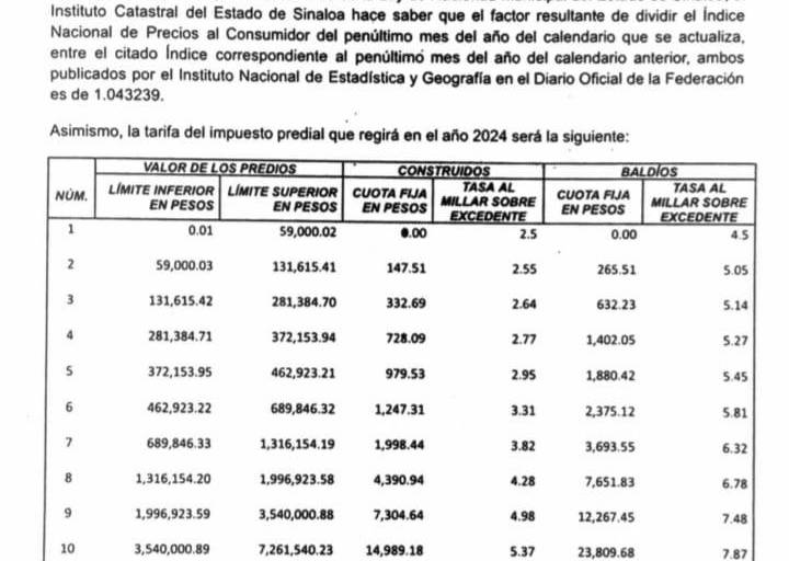 CULIACÁN._ Las tarifas del Impuesto Predial que regirán durante 2024, la cuales elaboró el Instituto Catastral de Sinaloa, fueron publicadas en el Periódico Oficial del Estado.