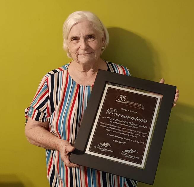 Por su entrega y destacada labor profesional, enmarcado en los más altos principios éticos y valores morales, Rosa María Gómez Garza, recibió en el 2013 el Premio a la Trayectoria Profesional, por parte de la Asociación de Colegios de Profesionales de Culiacán A.C. premios que próximamente están por entregarse en Culiacán, en una nueva edición.