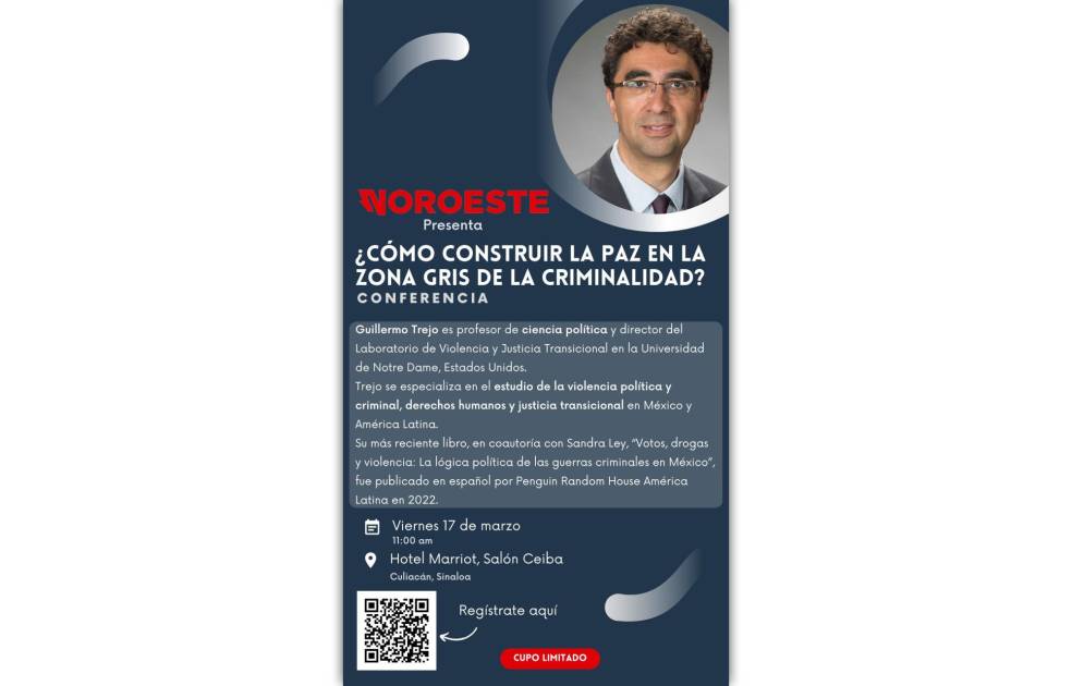 Para asistir a la conferencia magistral de Guillermo Trejo, “¿Cómo construir la paz en la zona gris de la criminalidad?”, que Noroeste realiza en el marco de su aniversario 50, es necesario registrarse en el siguiente enlace: https://forms.gle/SCNuGMuJHe38mqeAA