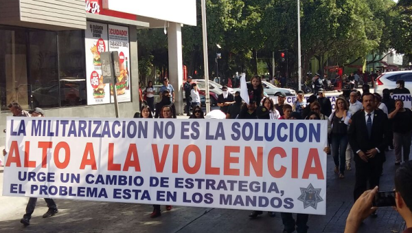 La manifestación se hizo por policías encapuchados, que con una marcha desde Catedral hasta Palacio de Gobierno cargaron pancartas con leyendas que referían en rechazo a la permanencia de militares y a otras demandas, como la eliminación de los resultados de Control y Confianza.
