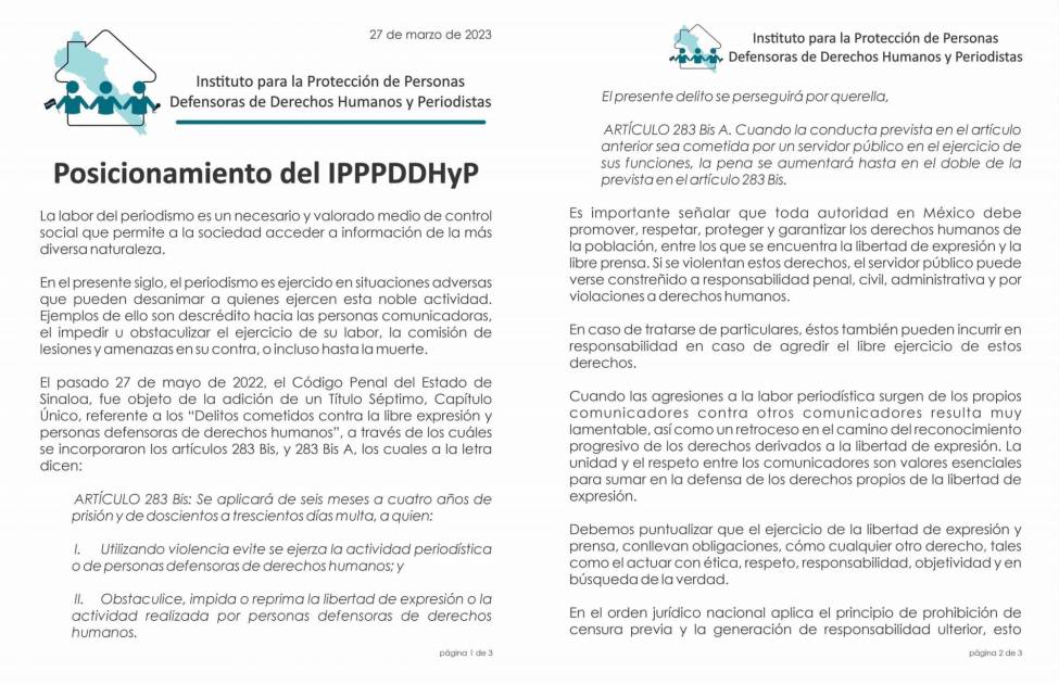 El Instituto para la Protección de Personas Defensoras de los Derechos Humanos y Periodistas de Sinaloa emitió un posicionamiento en el que rechaza las difamaciones entre miembros del gremio periodístico del estado, después de que Noroeste y Revista Espejo publicara una investigación conjunta que liga al Partido Sinaloense con al menos cinco sitios de Internet locales.
