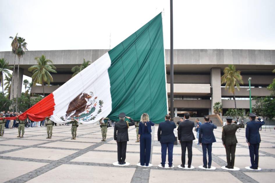 Estuvo encabezado por el Secretario de Economía Estatal, Javier Gaxiola Coppel, quien se encargó de activar los comandos para izar el lábaro patrio en lo más alto de la plaza cívica.