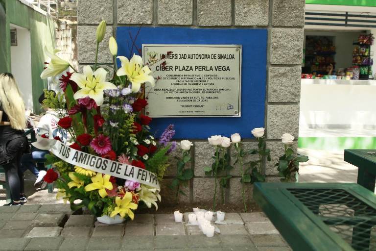 Esta mañana, en la Facultad de Estudios Internacionales y Políticas Públicas de la Universidad Autónoma de Sinaloa, compañeros y amigos de la maestra Perla Lizeth Vega Medina la recordaron, le leyeron cartas, cantaron y llevaron arreglos florales a una cyberplaza que lleva su nombre.