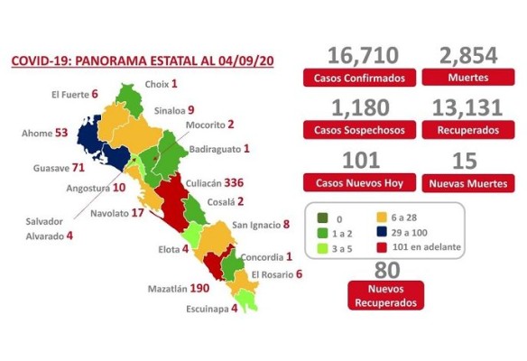 (80 nuevos. Culiacán 41, Mazatlán 24, Ahome 4, Guasave 3, Navolato 2, Salvador Alvarado 1, Badiraguato 1, Mocorito 1, Cosalá 1, Choix 1, Concordia 1)